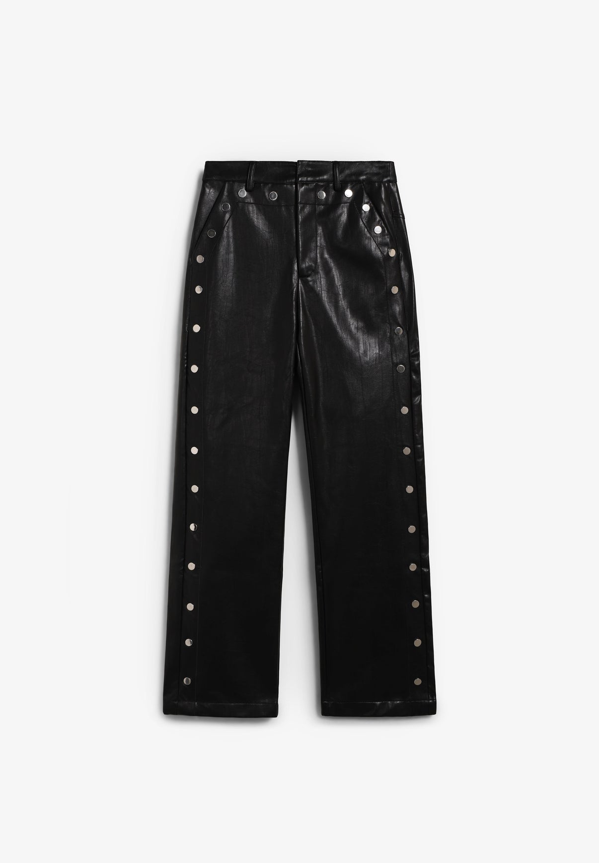 Pantalón Laagam confeccionado en 100% viscosa y ajuste relajado. Cuenta con trabillas para cinturón, bolsillos funcionales, detalle de botones a presión lo largo de las costuras laterales y una pernera ancha. Detalle etiqueta con logotipo en la parte trasera.