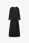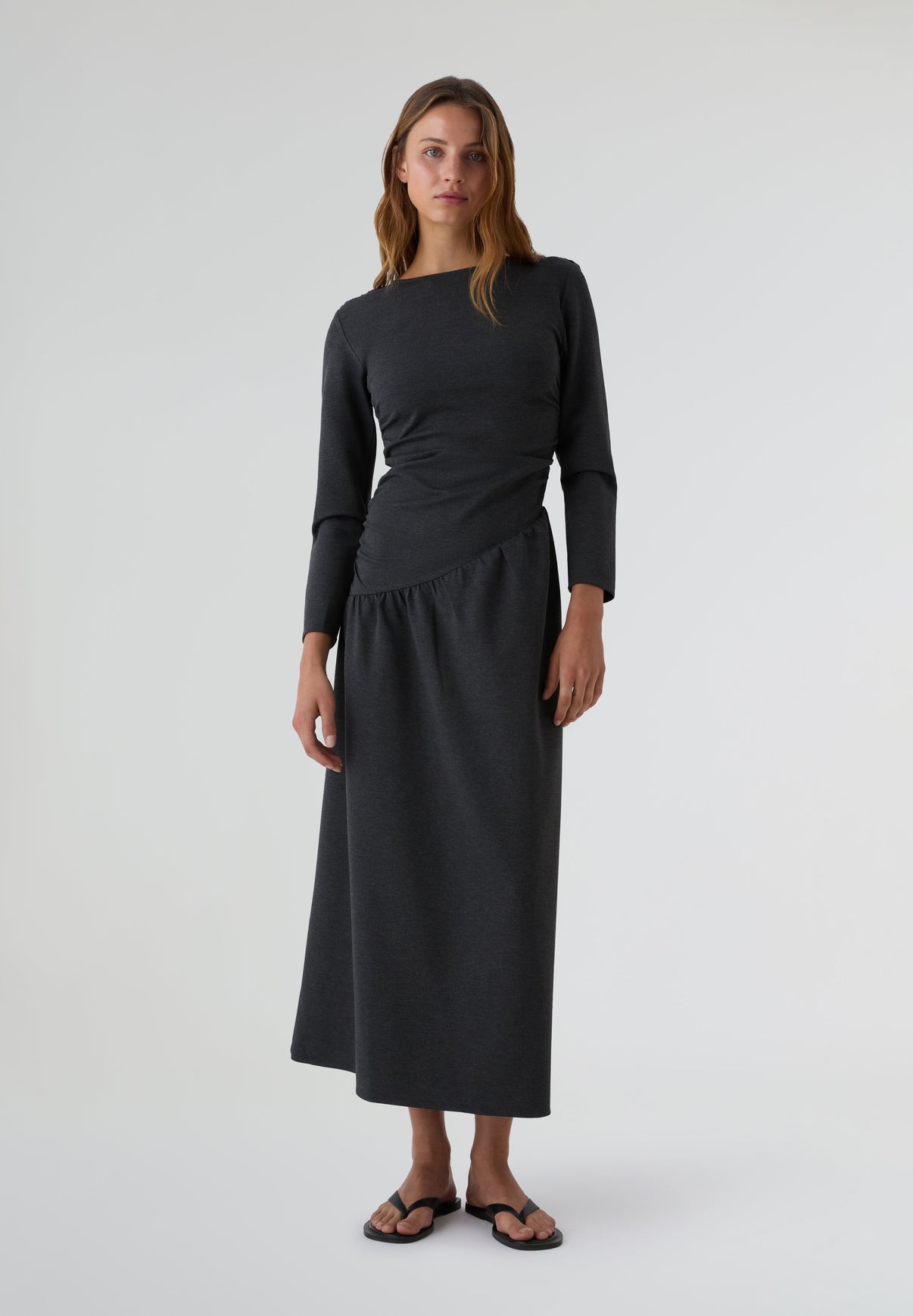 Vestido Laagam confeccionado en 54% rayón, 31% nailon y 5% elastano. Presenta un corte midi elástico de manga larga con silueta ajustada. Cuerpo drapeado con costura diagonal de cintura a cadera, falda midi evasé con pliegues desde la cintura, espalda abierta con cierre de botones bajo el cuello y canesú drapeado en la parte superior.