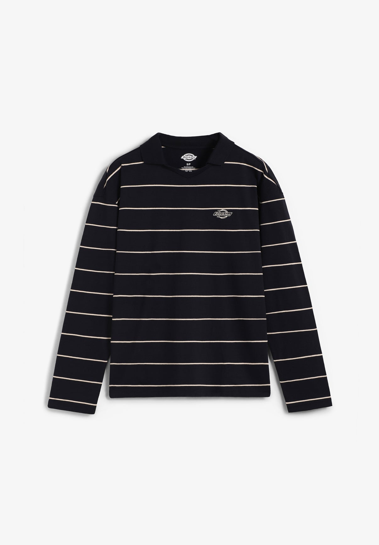 Polo Dickies confeccionado en tejido de algodón 100% y corte cuadrado. Presenta un cuello clásico, aberturas laterales para mayor libertad de movimiento y un motivo de rayas horizontales. Detalle del logotipo de Dickies bordado en el lado izquierdo del pecho.