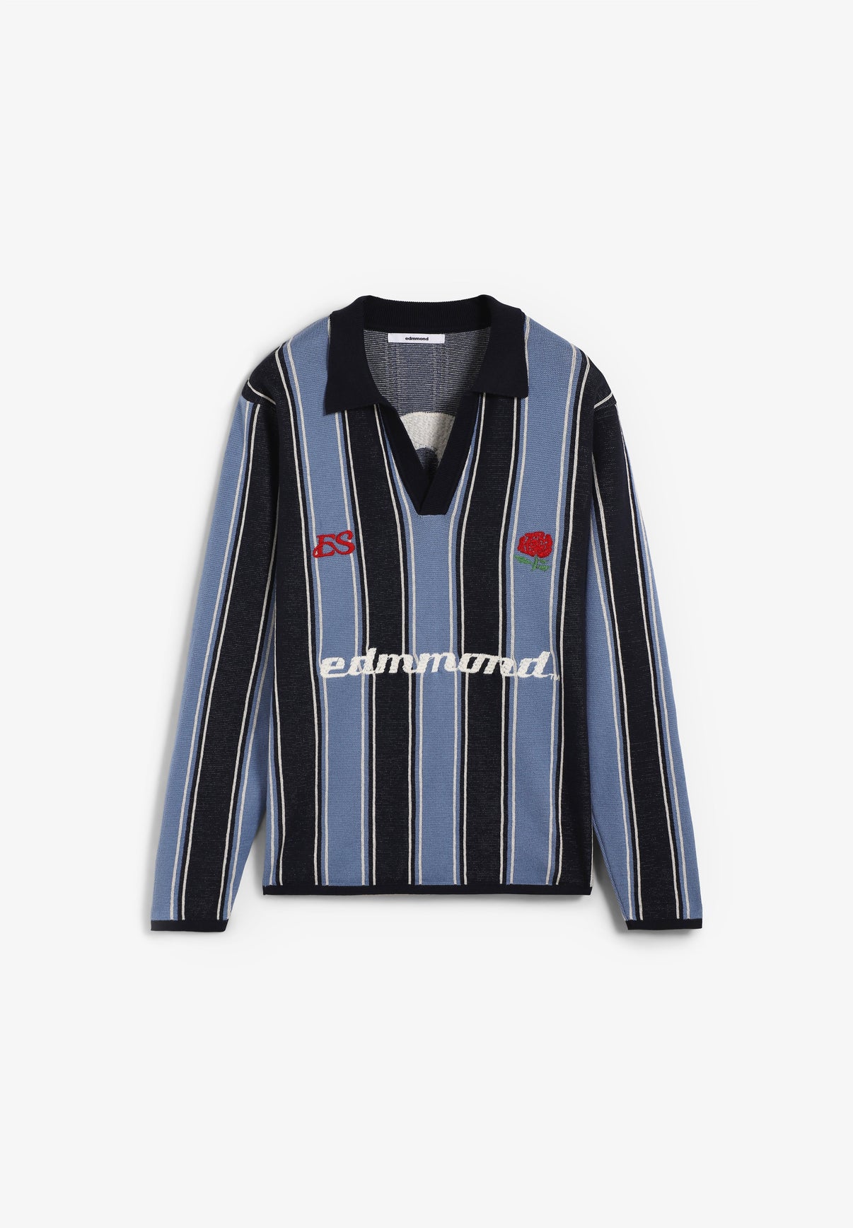 Polo Edmmond Studios confeccionado en 100% algodón, tonos azules con escote en puco y cuello camisero, de inspiración deportiva y diseño de rayas. Presenta bordados especiales en la parte delantera y en la espalda.