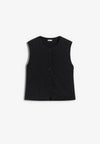 Chaleco Mi&co confeccionado en 66% poliéster, 20% viscosa, 10% lana y 4% elastano. Cuenta con cuello redondo, bajo con forma, corte recto y diseño de raya diplomática.