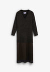 Vestido holgado confeccionado en mezcla de lana y viscosa. Largo midi y escote en V. Manga larga. Acabado en rib en escote, puños y bajo con detalle lencero en marrón y negro.