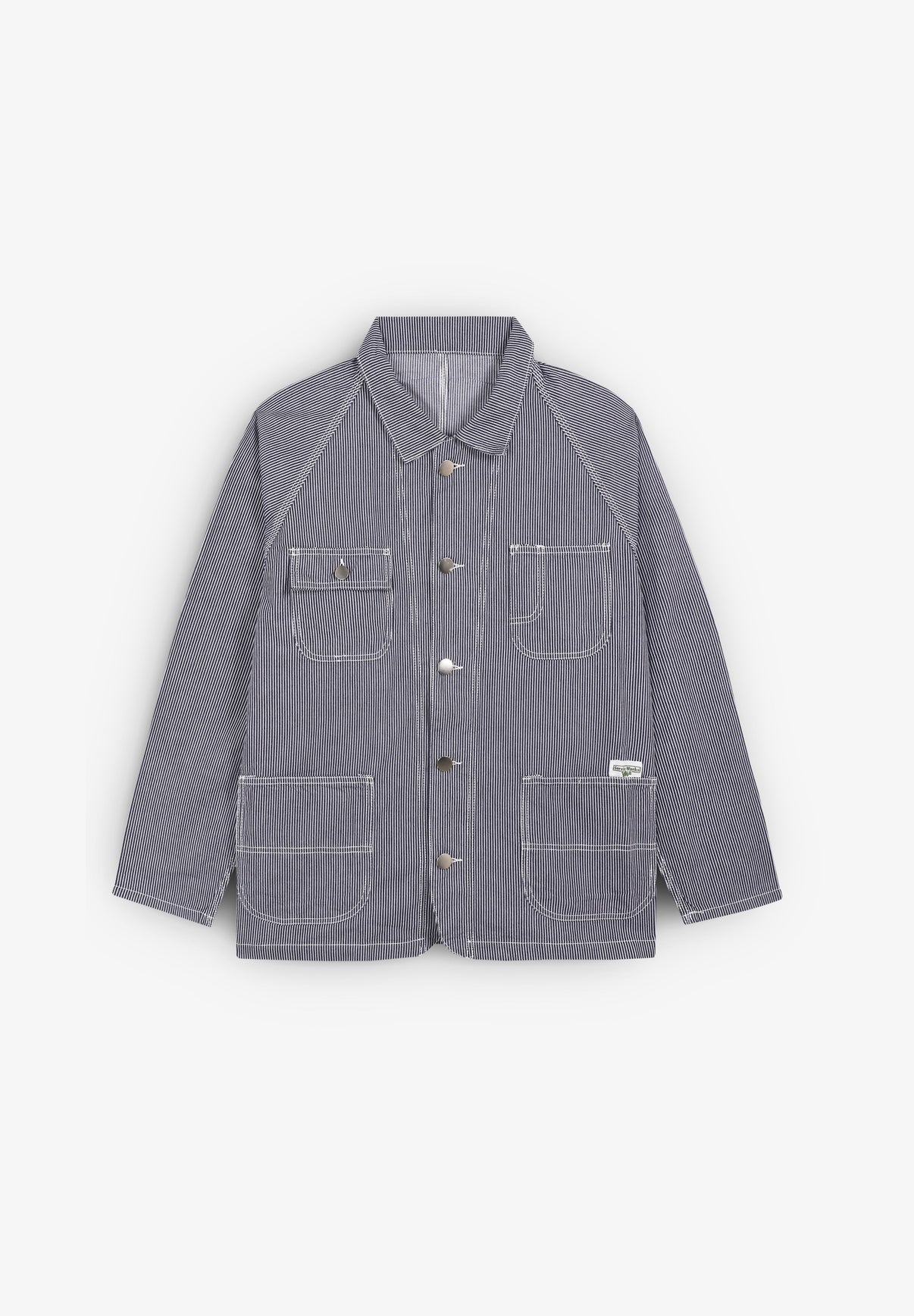 Worker con 4 bolsillos delanteros, cierre de 5 botones, mangas raglán, botones de níquel cepillado, pares de triple costura en contraste