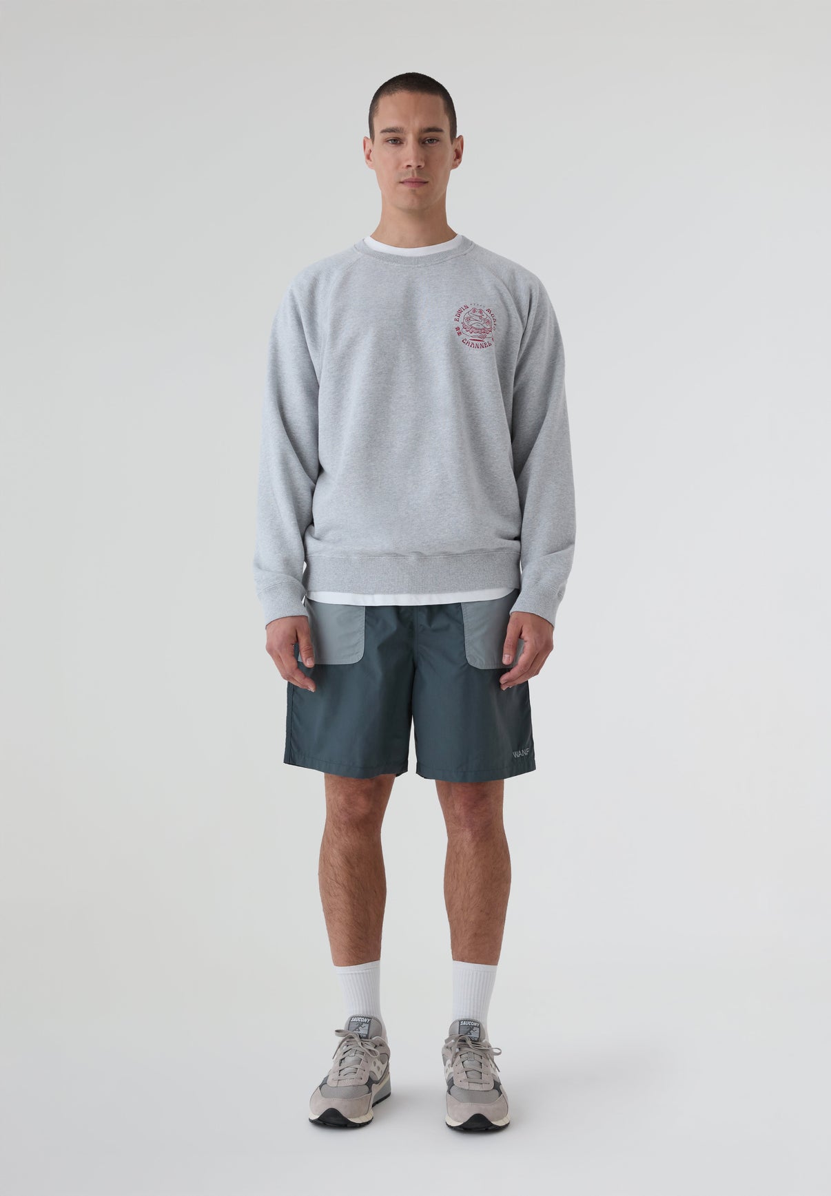 Edwin sweatshirt, standard fit. Made from 100% cotton. Features ribbed collar, cuffs, and hem. Includes prints on the chest and back.