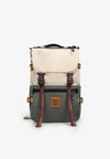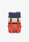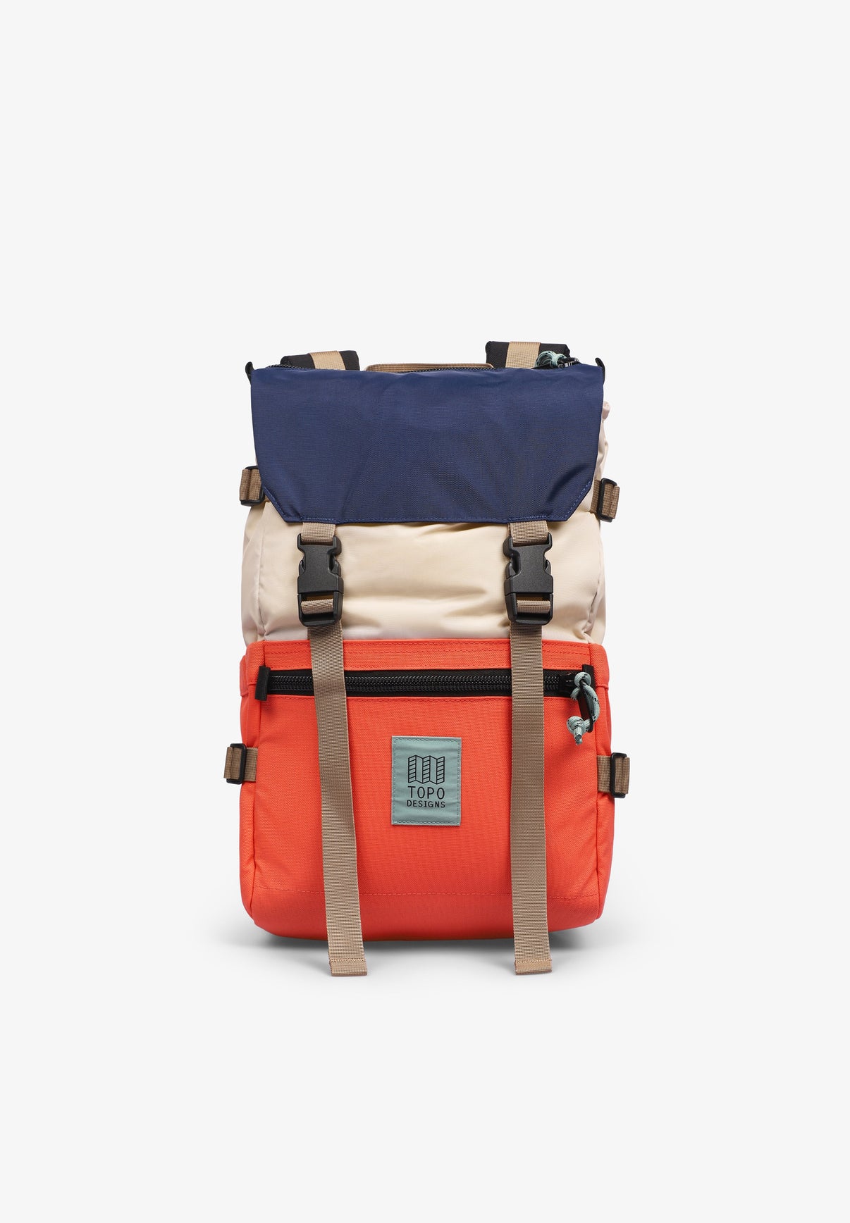 Mochila Topo Designs confeccionada en nailon reciclado. Presenta un amplio compartimento principal, solapa superior con doble cierre de hebilla, funda interna acolchada apta para portátiles de 15", bolsillos laterales ajustables para botellas de agua, correas de compresión laterales dobles, asa de transporte superior y lazos de sujeción para bolsa de viaje PackFast™.