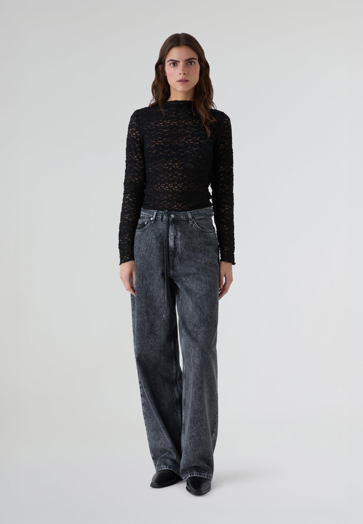 Grace & Mila lace T-shirt made from 60% polyamide, 30% cotton, and 10% elastane. It features a fitted cut, sheer fabric, and a high neckline with scalloped edges.