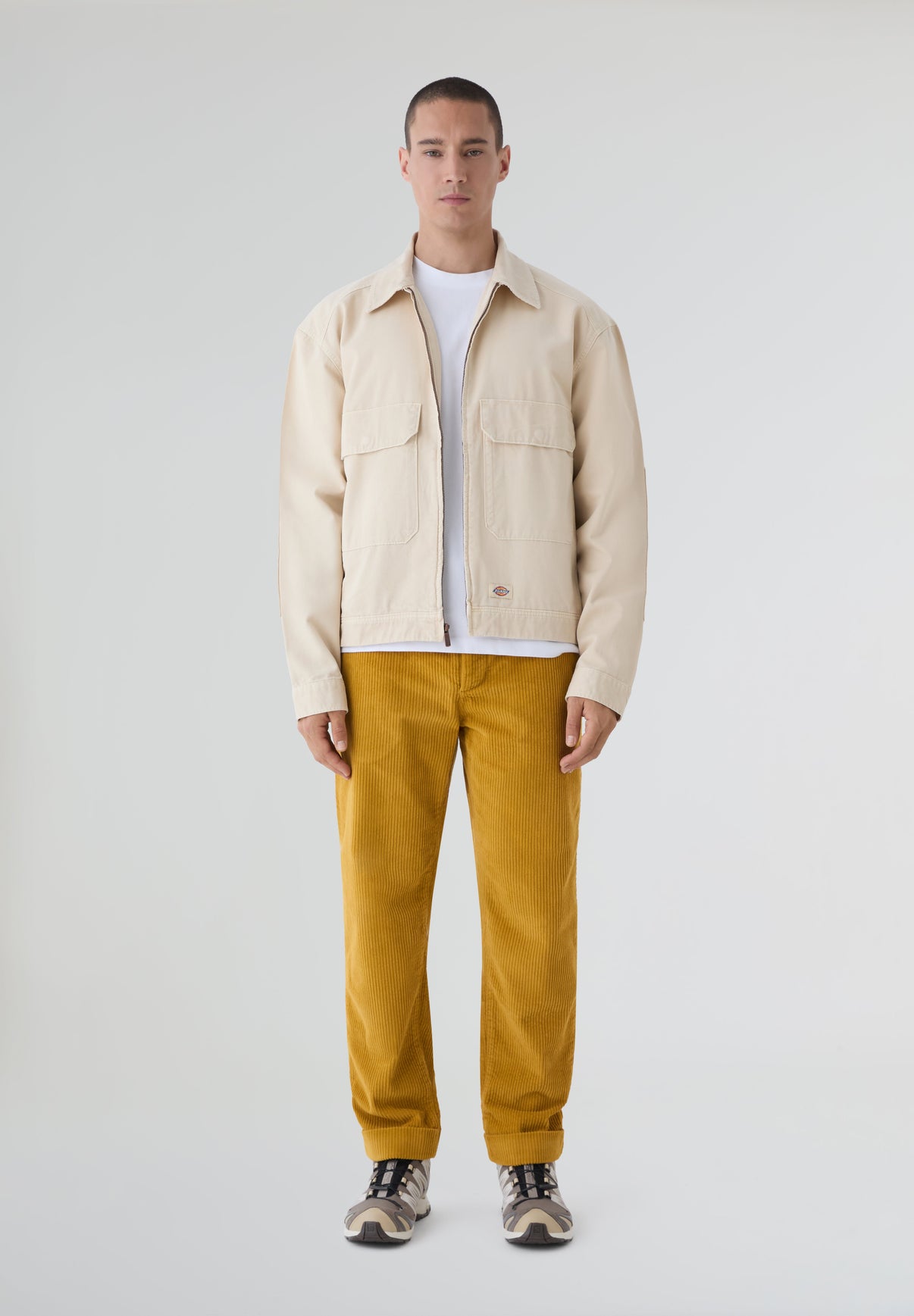 Edmmond Studios trousers made from 100% cotton with a carrot cut. They feature side pockets, two back pockets with button closures, a button fly, and a turn-up hem. An embroidered label detail adorns the back.