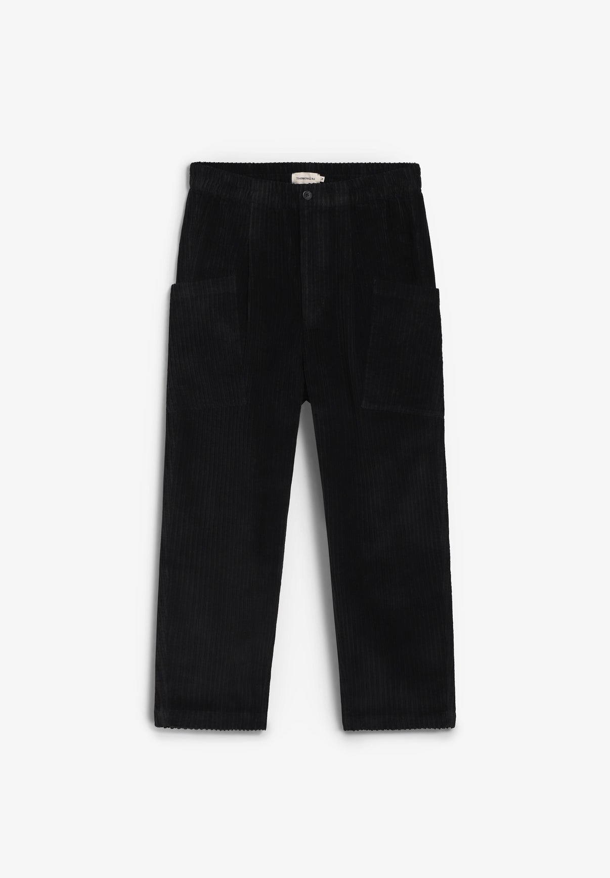 Pantalón Thinking Mu confeccionado en algodón orgánico y ajuste relajado. Cuenta con un tiro medio, pernera ancha y bajo con elástico. Presenta un cierre con cremallera y botón frontal con banda elástica, banda elástica en la cintura y pliegues frontales.