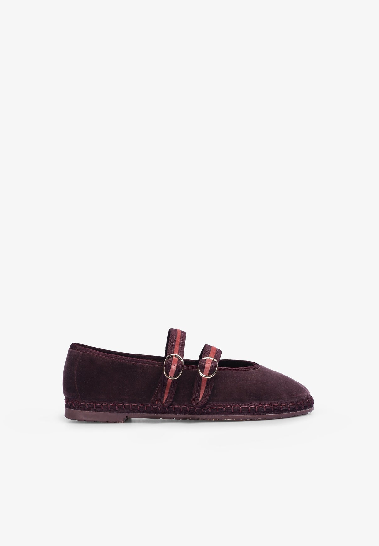 Slippers Flabelus de terciopelo en morado con ribete berenjena y doble tira de terciopelo morado y rosa con cierre de hebilla. El interior del zapato es 100% algodón orgánico con tratamiento antibacteriano y la suela está hecha de caucho reciclado.