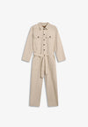 American Vintage jumpsuit made from 100% cotton. It features a wide fit, classic collar, button closure, removable belt, and two flap pockets on the chest, two Italian pockets, and two patch pockets on the back.