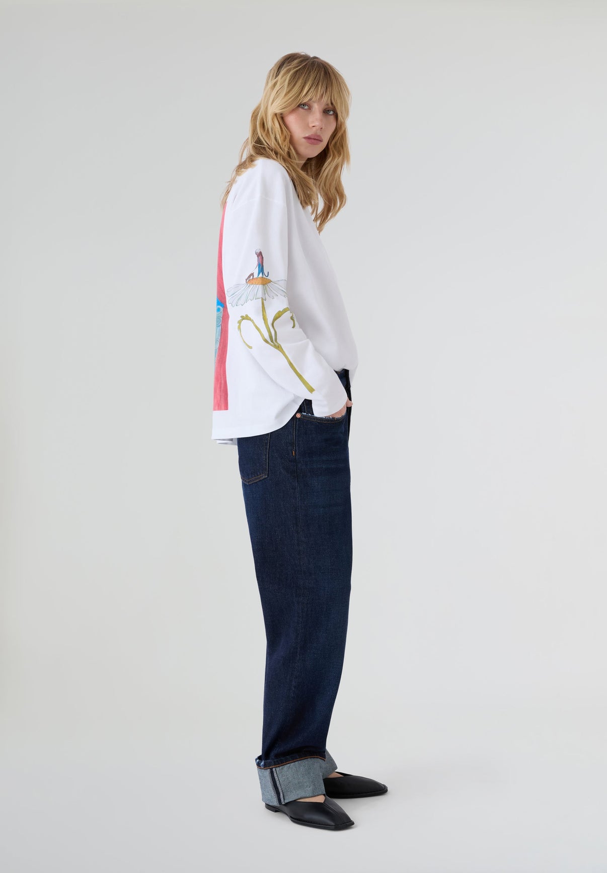 Romualda T-shirt made from 100% cotton. It features long sleeves, a star and cupid print, a girl on a daisy, and a puppet of frogs in a pond, hand-painted by Romualda's creative director.