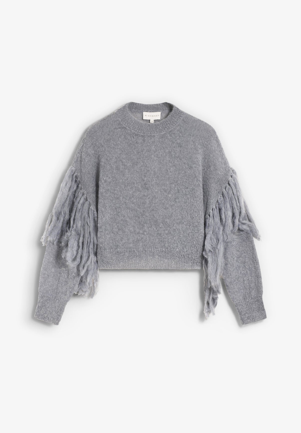 Michonet sweater made from 40% nylon, 32% mohair, and 28% wool. It features fringed sleeves, a round neck, and a fitted waist to flatter the figure.