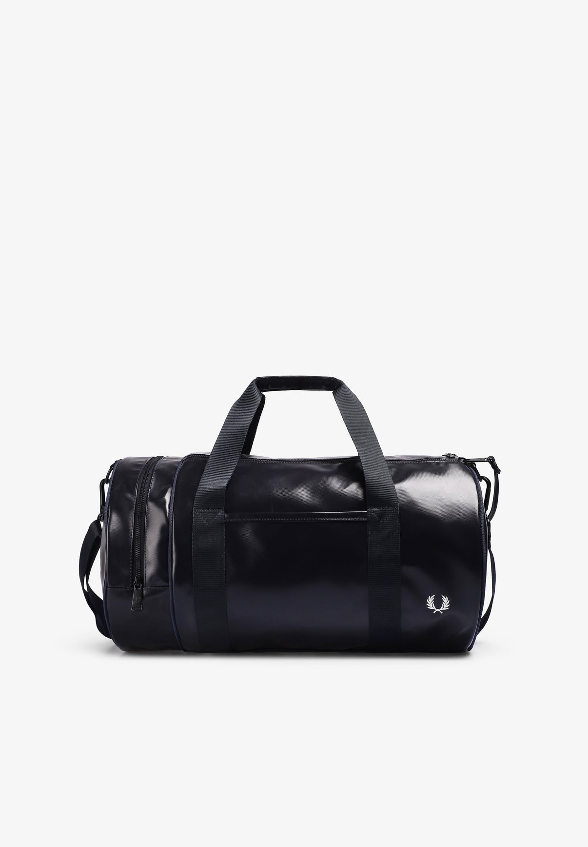 Fred Perry bag made from recycled polyester with a TPU coating. Features matte black metal details, a double zip closure, and a zipped compartment at the end. Canvas trim in a darker shade runs along the main body, and the brand logo is displayed on the side.