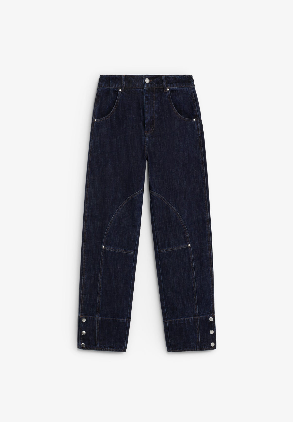 Laagam jeans with a wide silhouette, curved front seams, and rounded pocket flaps. The lower pieces feature cuffs, snap closures, and a front zip and metal button fastening.