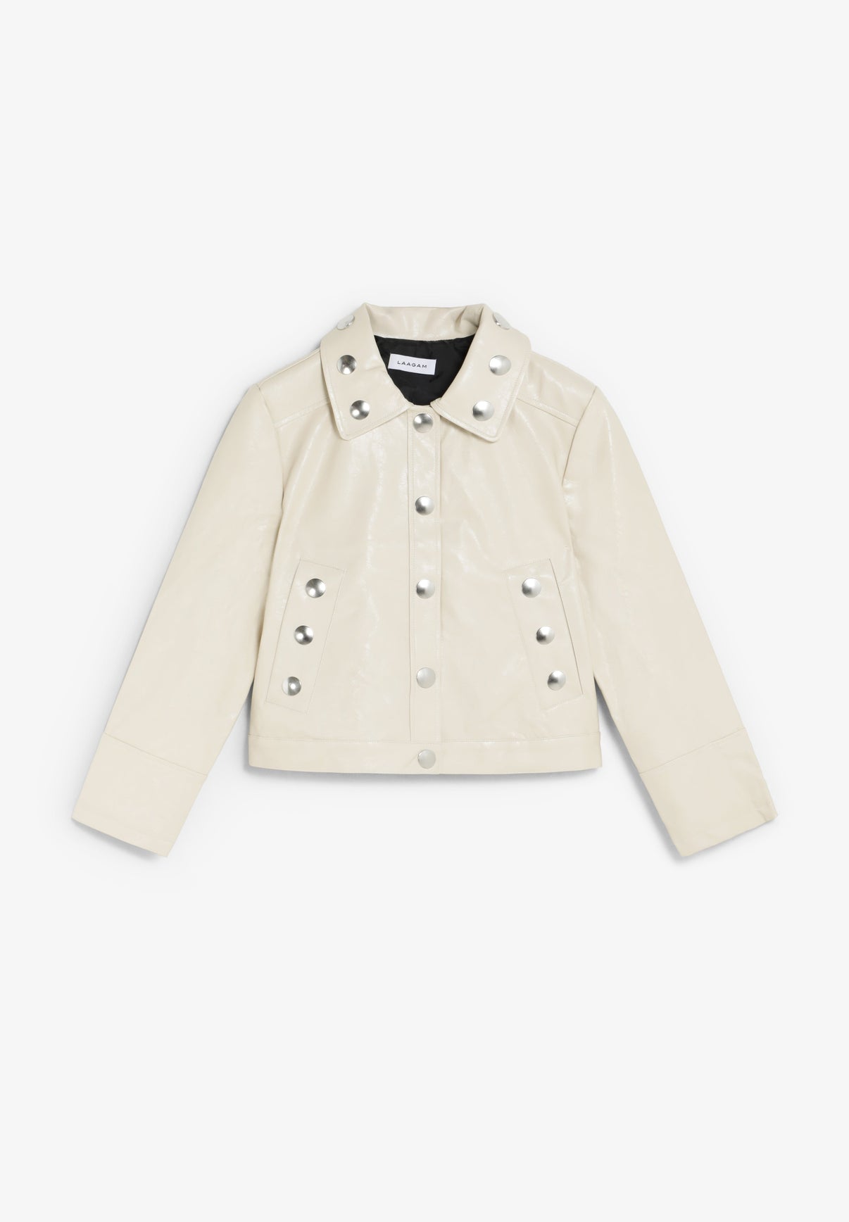 Laagam jacket made of faux leather with a rounded collar. Features silver metal buttons and details on the collar and pockets. Black lining.