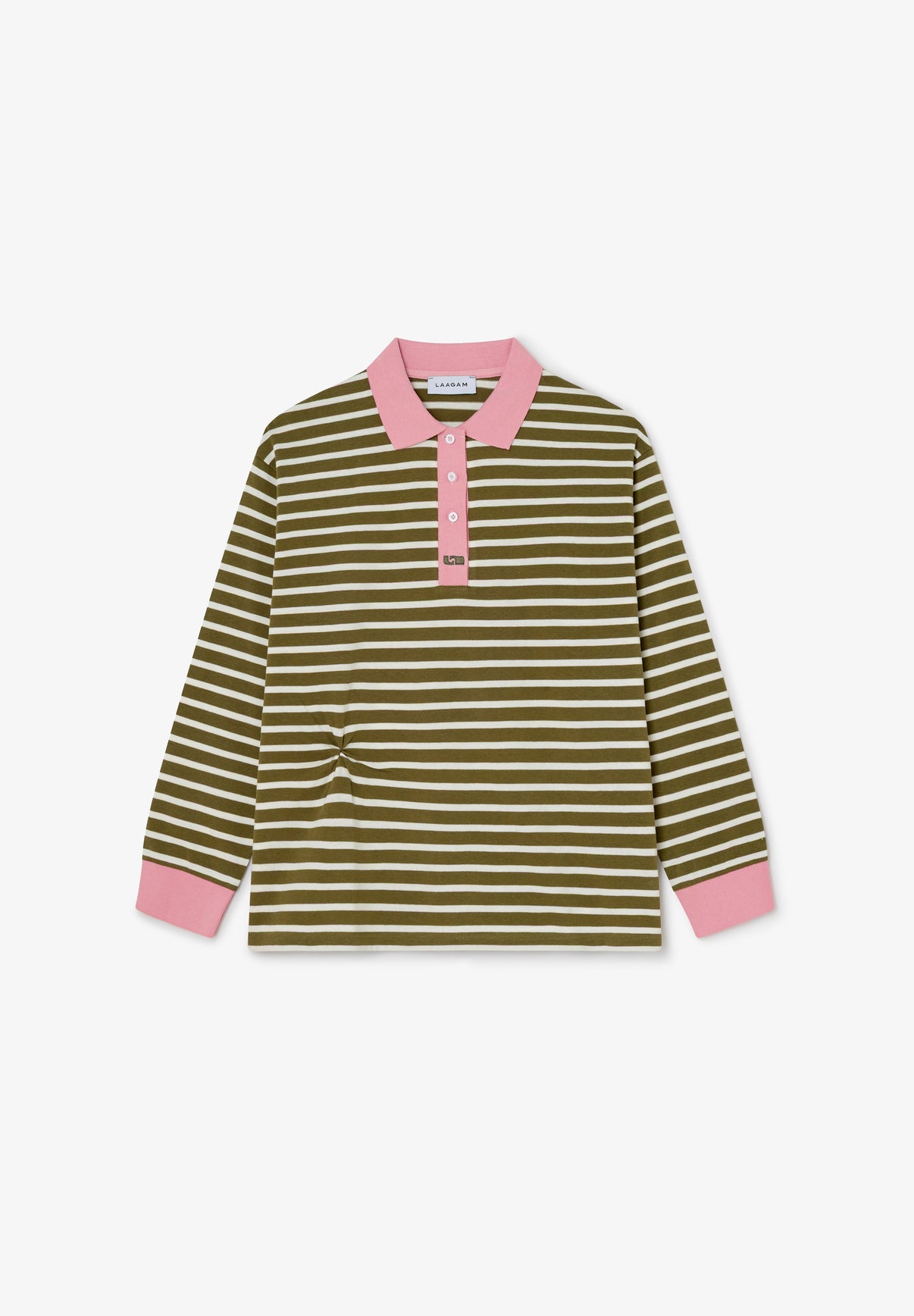 Laagam T-shirt with polo collar and contrasting cuffs and placket. It features an oversized fit, an embroidered logo detail on the placket, and an asymmetrical draped detail on the front.