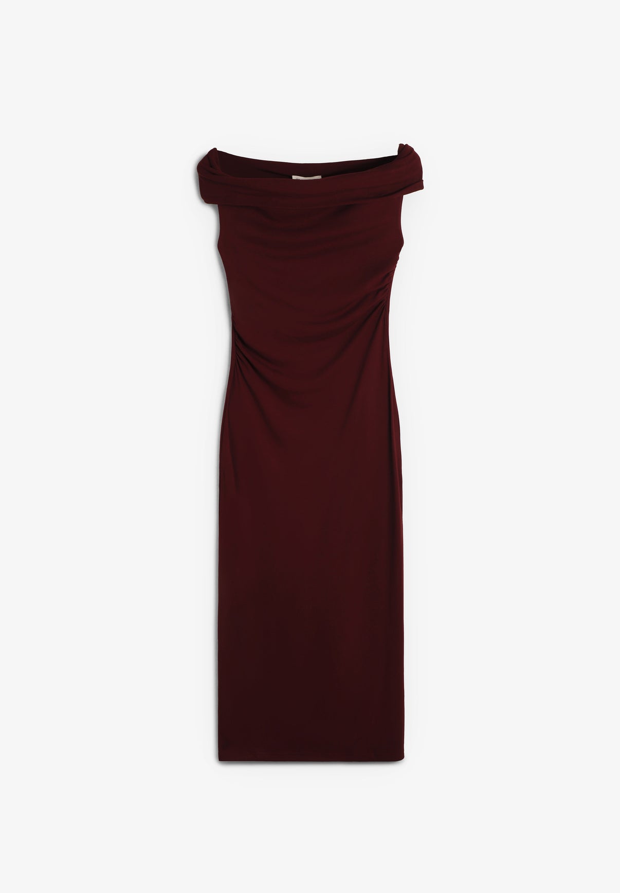 Dress GRACE % MILA made of 95% viscose and 5% elastane. It features an asymmetric neckline that delicately exposes one shoulder. Gathering at the shoulders and waist accentuate the draped effect.