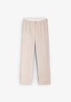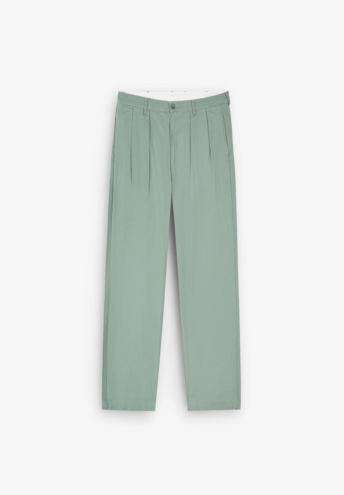 Pantalones con corte tipo globo, doble pliegue, trabillas para cinturón, bolsillos abiertos y etiqueta tejida con el logotipo de la marca