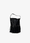 Bolso Mercules confeccionado 100% piel con forma de cubo con flecos. Presenta gran capacidad; cuenta con dos asas, una fija superior (38cm) para llevar al hombro o en la mano y una más larga (80cm) para poder llevarlo colgado o cruzado.