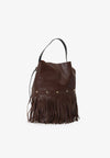Bolso Mercules confeccionado 100% piel con forma de cubo con flecos. Presenta gran capacidad; cuenta con dos asas, una fija superior (38cm) para llevar al hombro o en la mano y una más larga (80cm) para poder llevarlo colgado o cruzado.