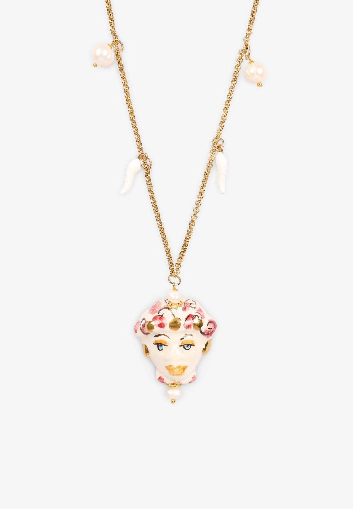 • Cabeza "Testa di Moro" fabricada en cerámica Siciliana de Caltagirone y perla de río.