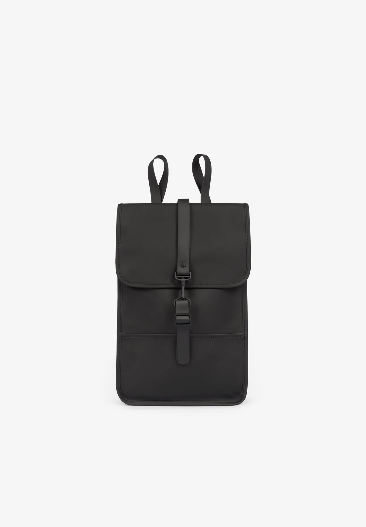 Mochila impermeable Rains confeccionada en tejido 100% poliéster revestido de poliuretano. Cuenta con correas traseras ajustables, cierre con solapa con imán, bolsillo para portátil de 13"/15" y mosquetón característico.