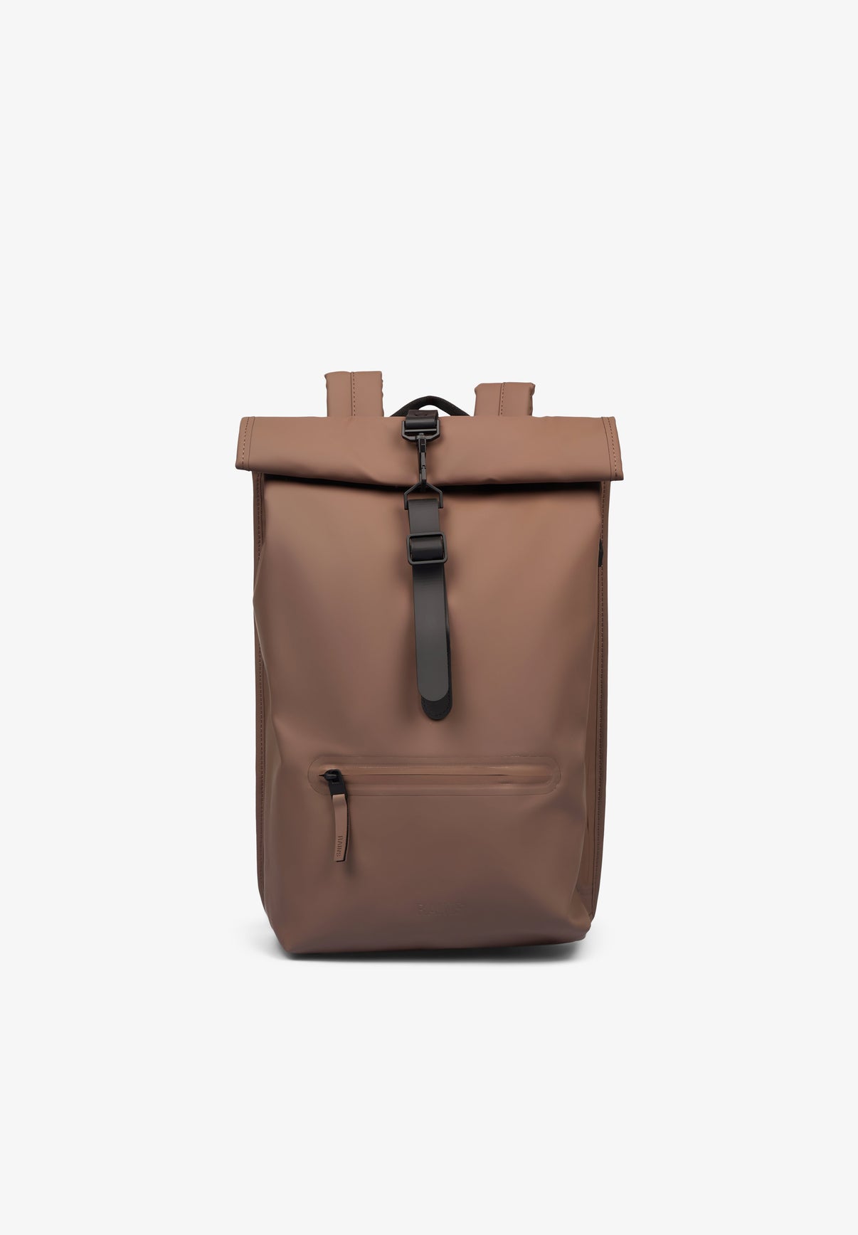 Mochila Rains Rolltop rucksack w3. Confeccionada con tejido de PU impermeable. Abertura superior enrollable con cierre de presión y mosquetón, bolsillo delantero con cremallera revestida. Bolsillo de acceso lateral plano con capacidad para un ordenador portátil de 16"