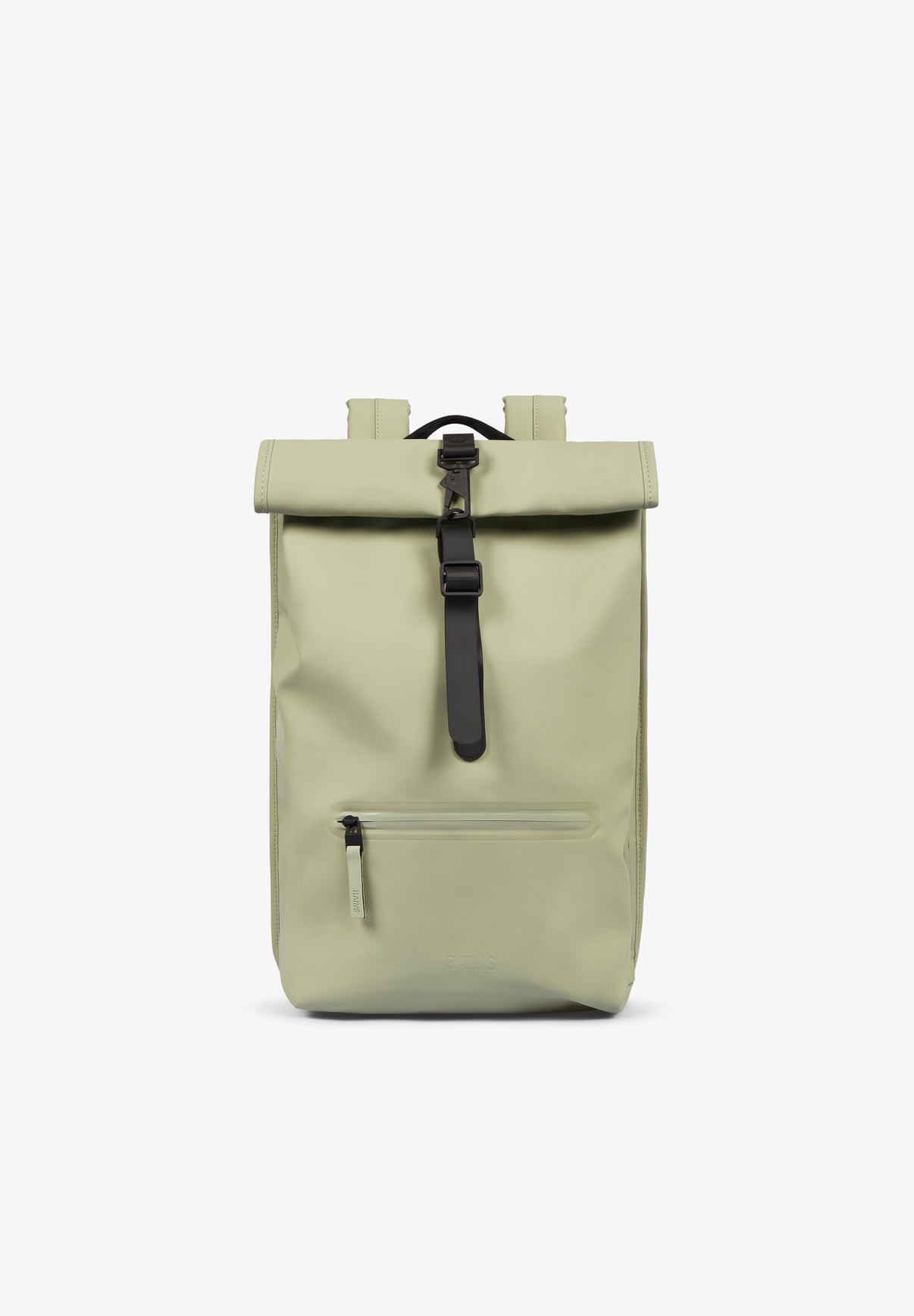 Mochila Rains Rolltop rucksack w3. Confeccionada con tejido de PU impermeable. Abertura superior enrollable con cierre de presión y mosquetón, bolsillo delantero con cremallera revestida. Bolsillo de acceso lateral plano con capacidad para un ordenador portátil de 16"