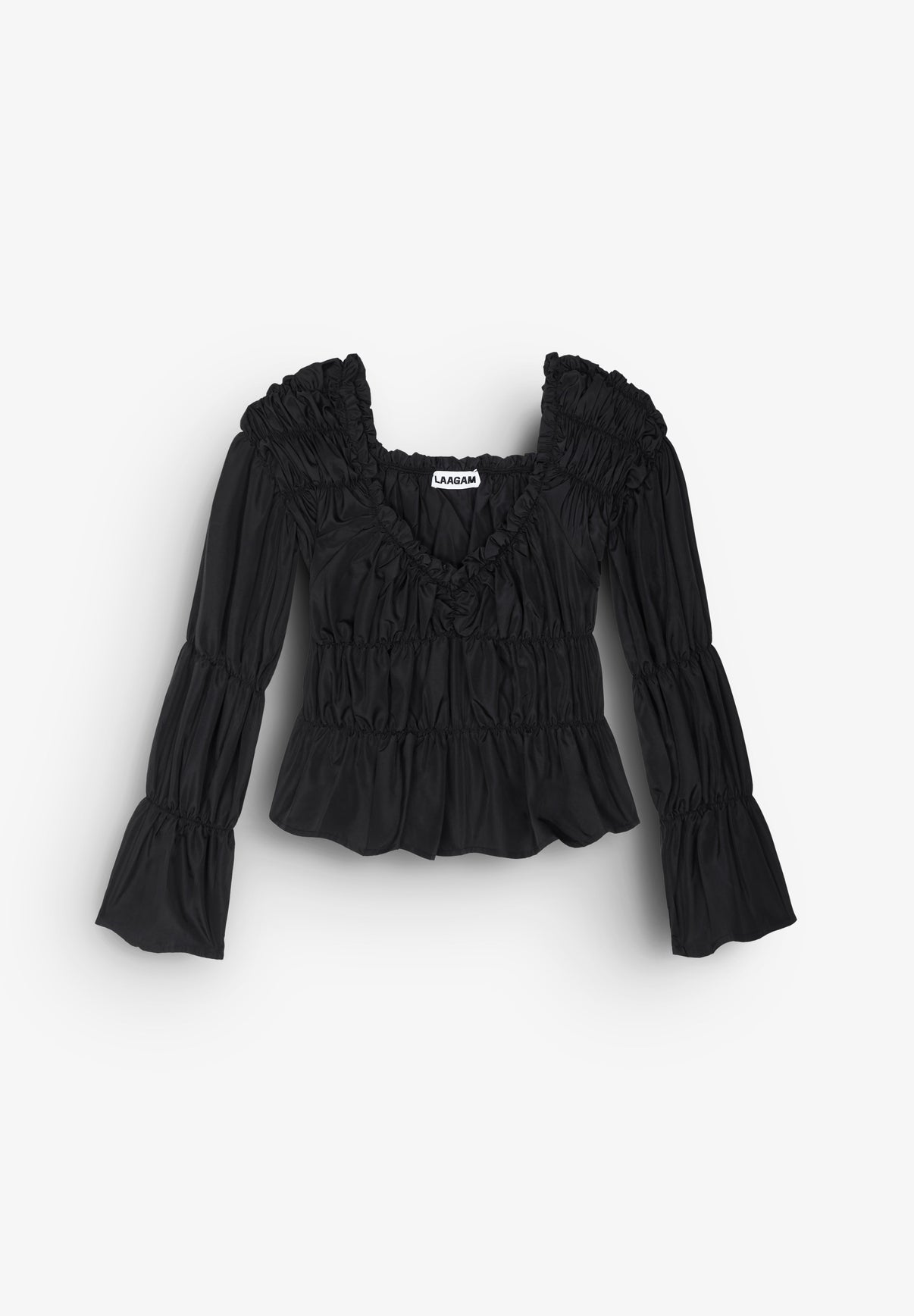 Blusa Laagam confeccionada en tejido 100% poliéster y corte estándar. Se trata de una blusa multiposición: hombros caídos o posición normal. Manga larga. bajo con volantes y detalle textura satinada y fruncidos.