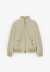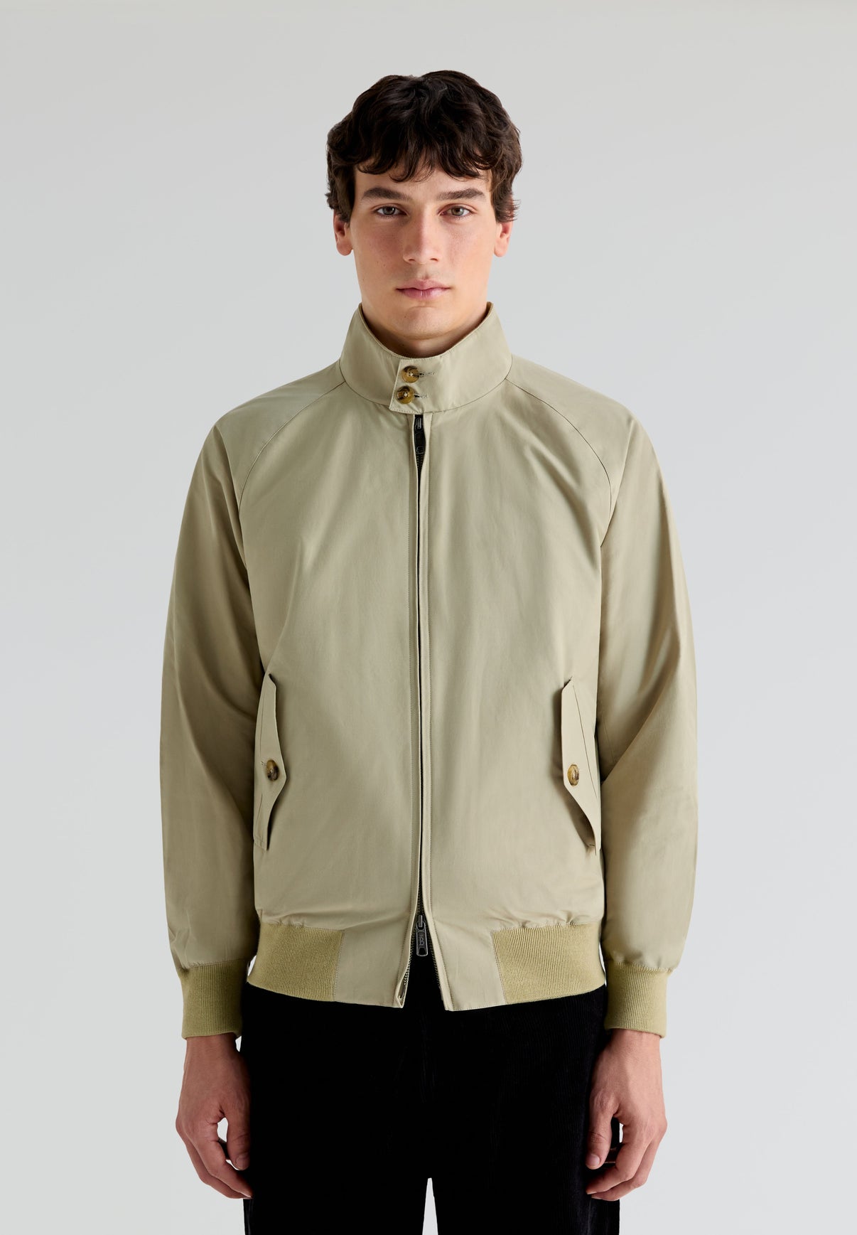 Chaqueta Baracuta confeccionada en 58% poliéster y 42% algodón. Presenta un cuello acanalado en tono sobre tono con cierre de doble botón, cremallera bidireccional con el logotipo, mangas raglán, dos bolsillos frontales diagonales con cierre de botón, puños y cintura acanalados, bolsillo interior y forro de tartán Fraser en algodón 100% transpirable.