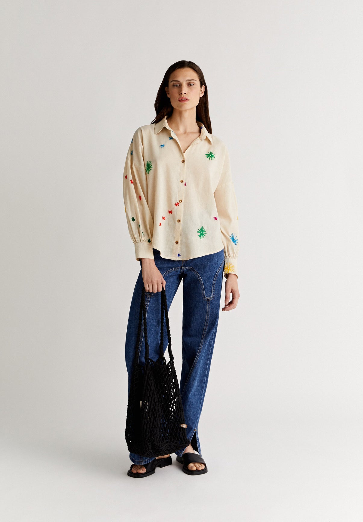 Blusa Enaguas confeccionadas en tejido 100% algodón con bordados, de corte holgado y cuello clásico. Hombros caídos con cierre abotonado y mangas abullonadas.