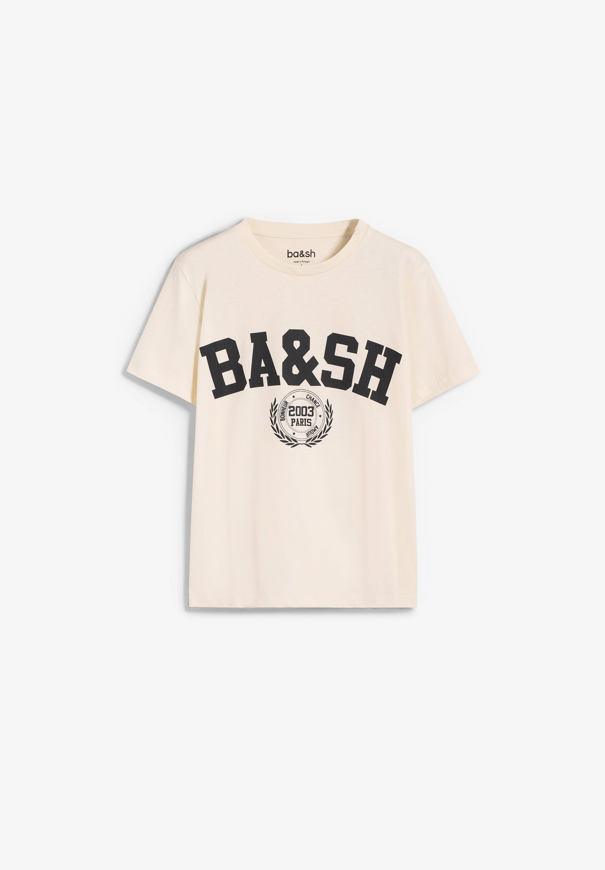 Camiseta Bash confeccionada en 100% algodón y corte clásico unisex. Presenta un estilo varsity, escote en contraste y estampado gráfico en la parte delantera.