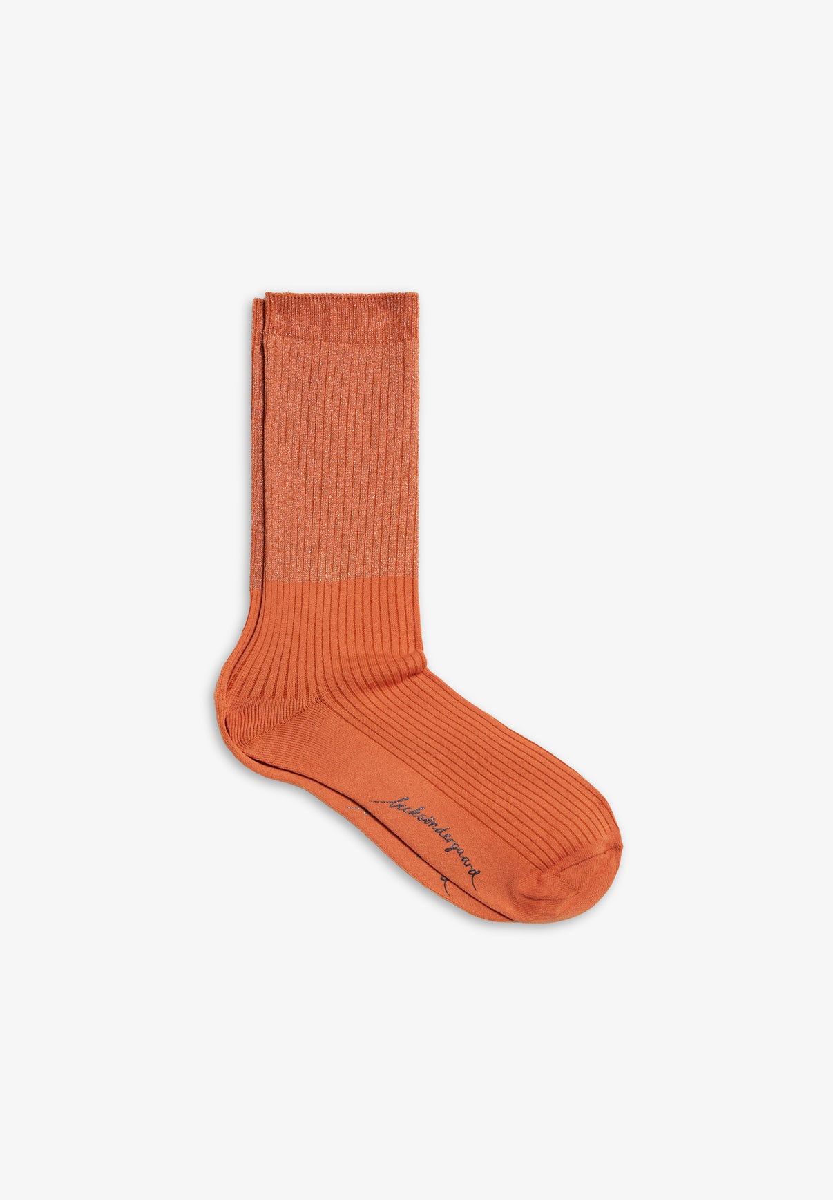 Calcetines Becksondergaard confeccionados en 50% poliamida, 43% poliéster, 4% elastano y 3% fibras metálicas. Presentan un ajuste cómodo y un aspecto brillante.