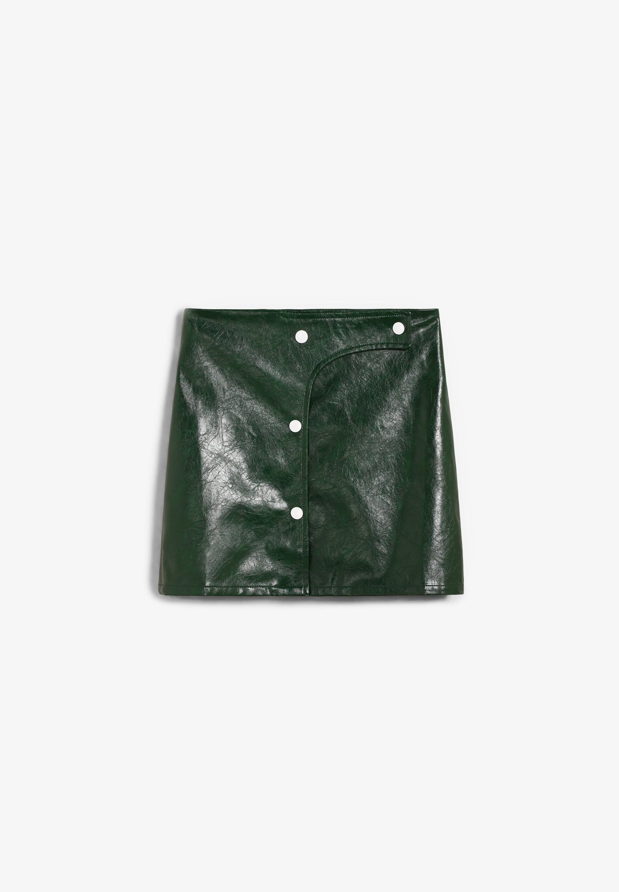 Falda confeccionada en tejido 100% poliéster y corte recto. Presenta un tiro alto, cierre con cremallera posterior invisible y botones en contraste. Detalle etiqueta logo marca.