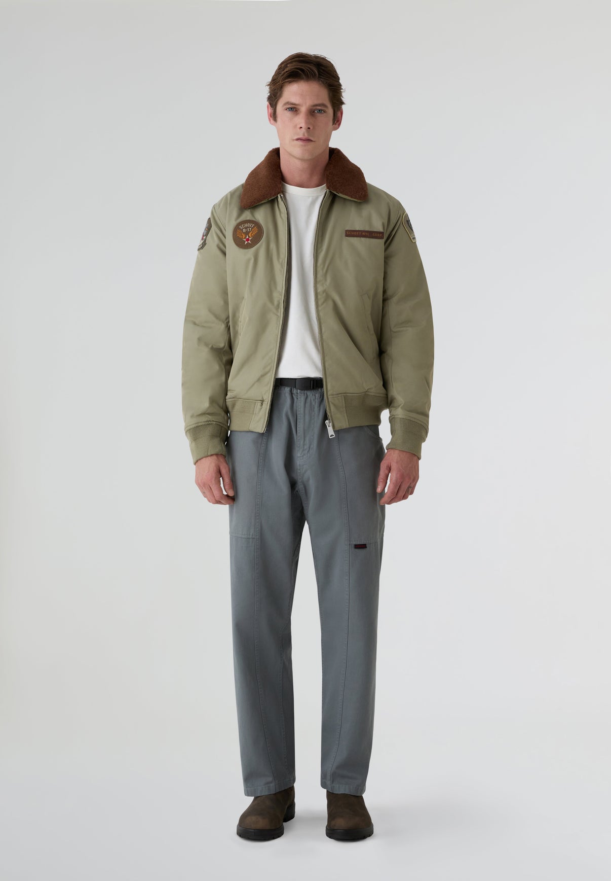 Chaqueta Schott NYC confeccionada en 70% algodón, 30% poliéster y forro 100% nylon. Presenta un diseño sencillo con el logo de la marca en el pecho, tres parches decorativos, uno en el pecho y uno en cada manga. Cuenta con un cuello desmontable, cierre frontal de botones, dos bolsillos laterales con solapa a presión y un bolsillo interior. Puños y cintura elásticos.
