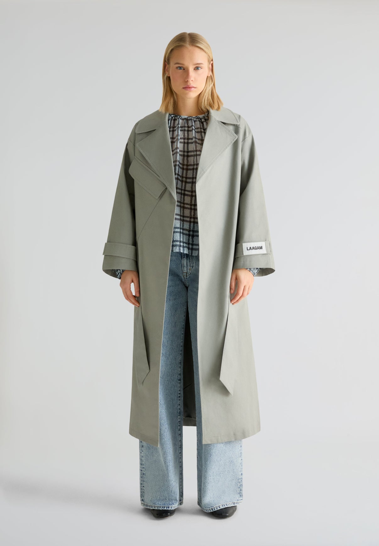 Gabardina Laagam confeccionada en 100% algodón y corte oversize. Cuenta con cuello solapa, manga corta, dos bolsillos laterales invisibles y autocinturón ajustable del mismo material. Ventilación en el dobladillo trasero.
