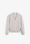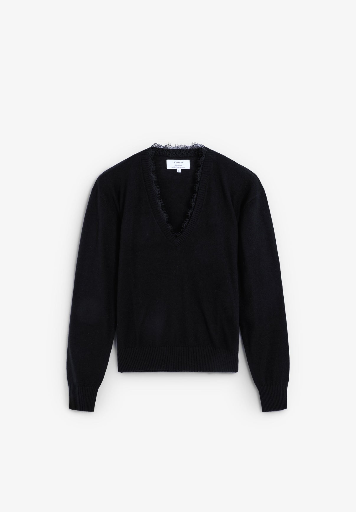 Jersey confeccionado en mezcla de lana y viscosa. Regular fit. Escote en V con detalles de encaje. Manga larga con puños y bajo acabados en rib.