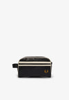 Neceser Fred Perry confeccionado en materiales reciclados con revestimiento y decorado con las rayas del distintivo ribete y el logotipo en tono dorado metalizado. Cuenta con un asa lateral de transporte, bolsillo interior con cremallera y bolsillo exterior abierto.