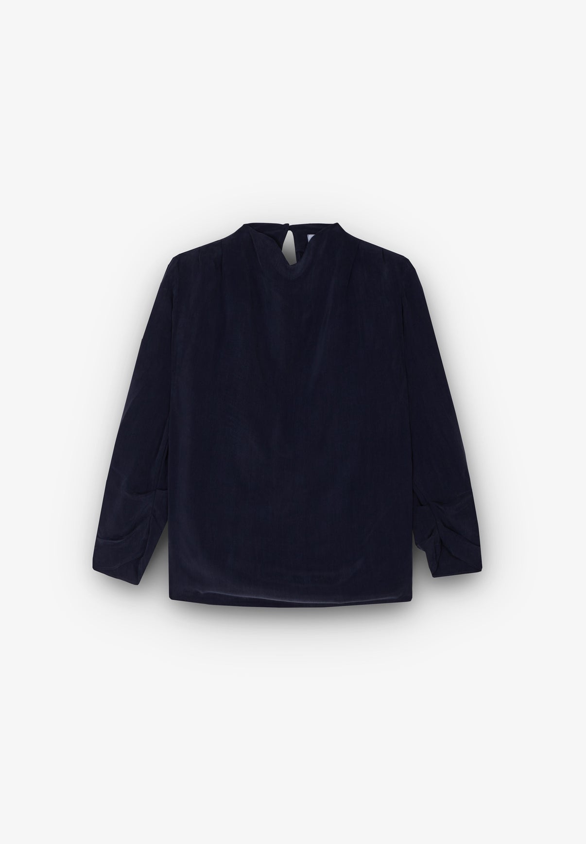 Blusa Ramsos cupro de color azul marino, con escote drapeado cerrado y hombreras estructuradas. Mangas con detalles fruncidos.