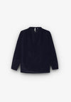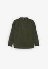 Blusa Ramsos cupro de color verde oliva, con escote drapeado cerrado y hombreras estructuradas. Mangas con detalles fruncidos.
