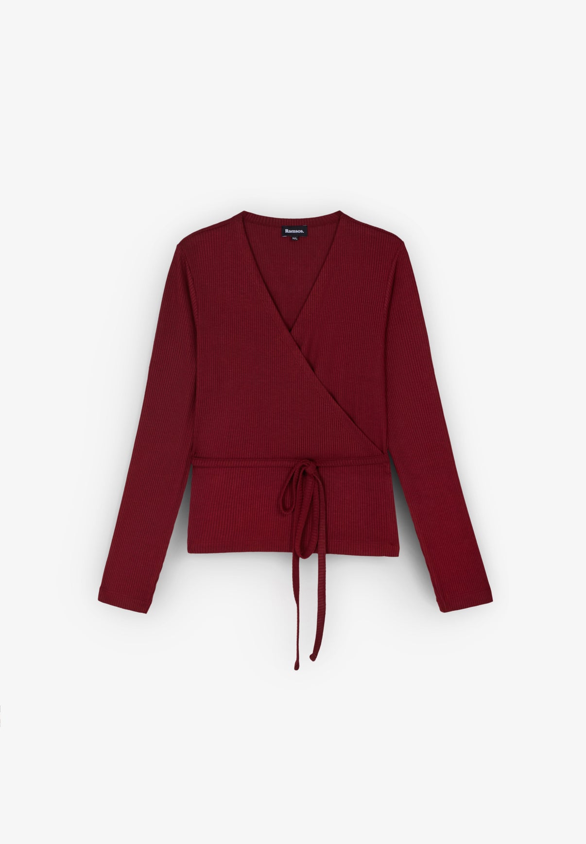 Top punto Ramsos en color burdeos confeccionado en tejido mezcla 68% poliéster reciclado, 45% de rayón y 4% elastano. Top cruzado con lazo lateral.