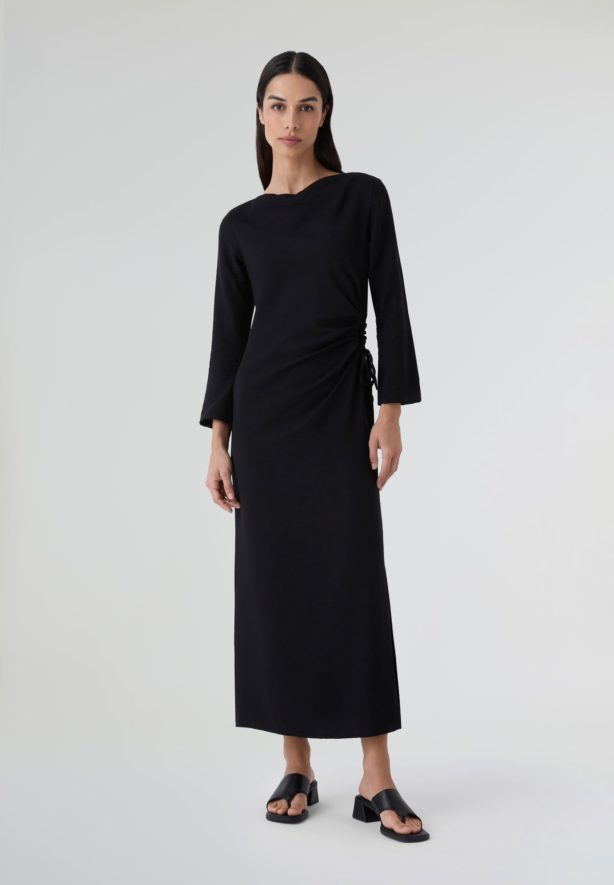 Vestido Ramsos confeccionado en tejido mezcla 93% rayón y 7% poliamida. Recorte lateral ajustable con lazo y aberura lateral.