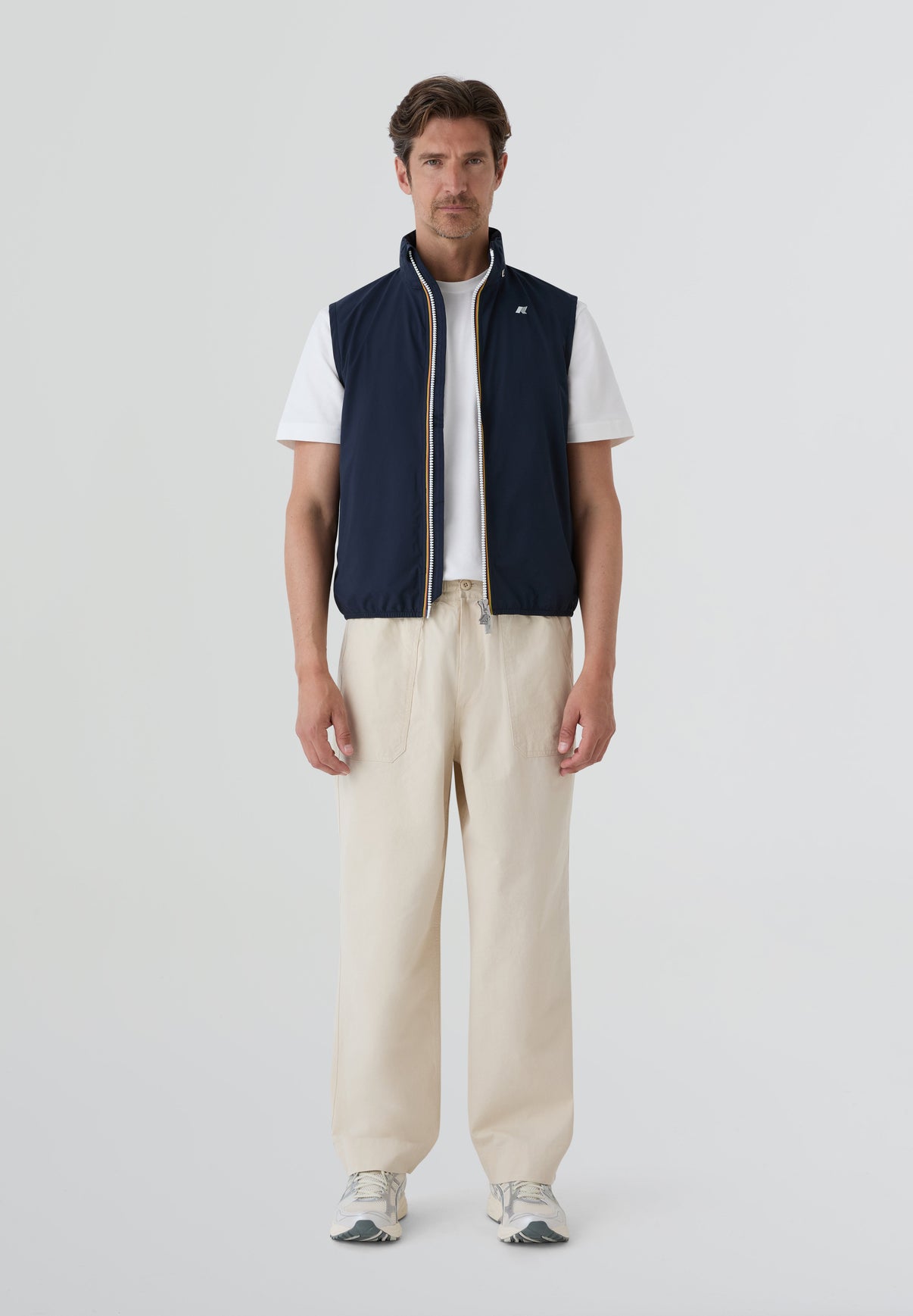 Chaleco K-Way confeccionado en tejido de poliéster 100%, elástico impermeable, repelente al agua, cortavientos y transpirable. Membrana interior con logo estampado, costuras termoselladas y 2 bolsillos con cremalleras.