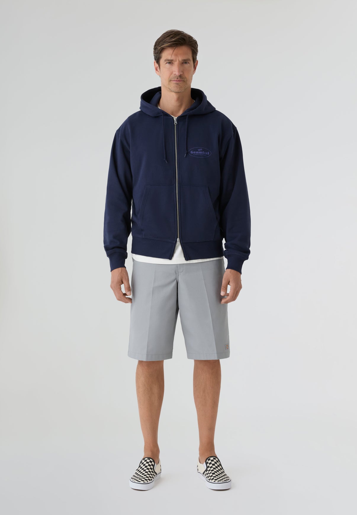 Sudadera Gramicci confeccionada en 100% algodón con forro polar. Cuenta con una cremallera frontal completa, capucha, bolsillos calientamanos y un llamativo estampado en la parte posterior.