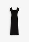 Vestido Laagam midi de punto con escote drapeado asimétrico. Mangas cortas drapeadas. Espalda abierta con detalle de hebilla metálica en imagotipo.