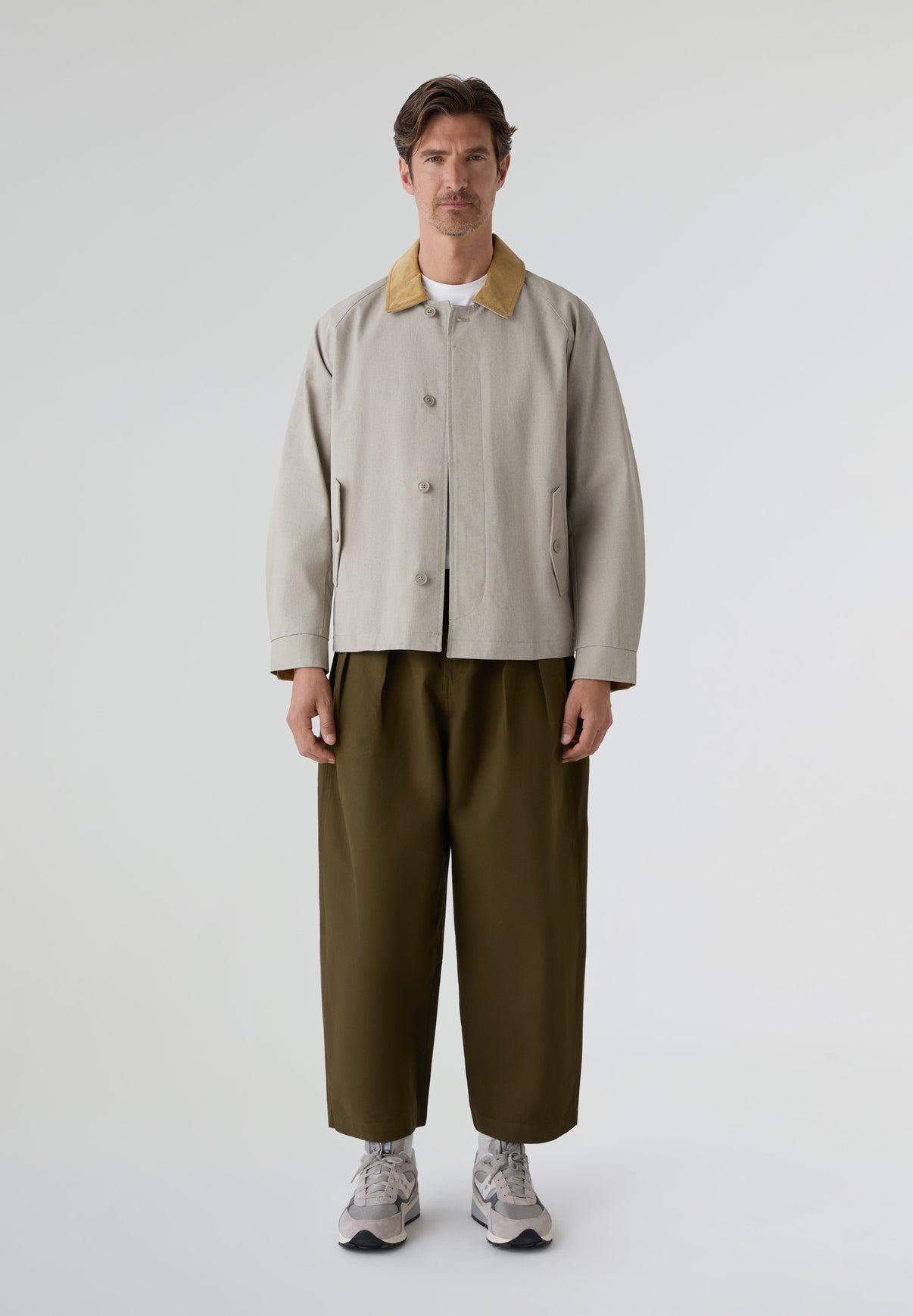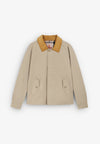 Chaqueta Baracuta confeccionada en 98% algodón y 2% lino, con corte regular. Presenta un cuello vuelto de pana, mangas largas con puños ajustables, cierre con botones ocultos, dos bolsillos laterales, y forro interior con estampado de tartán.
