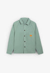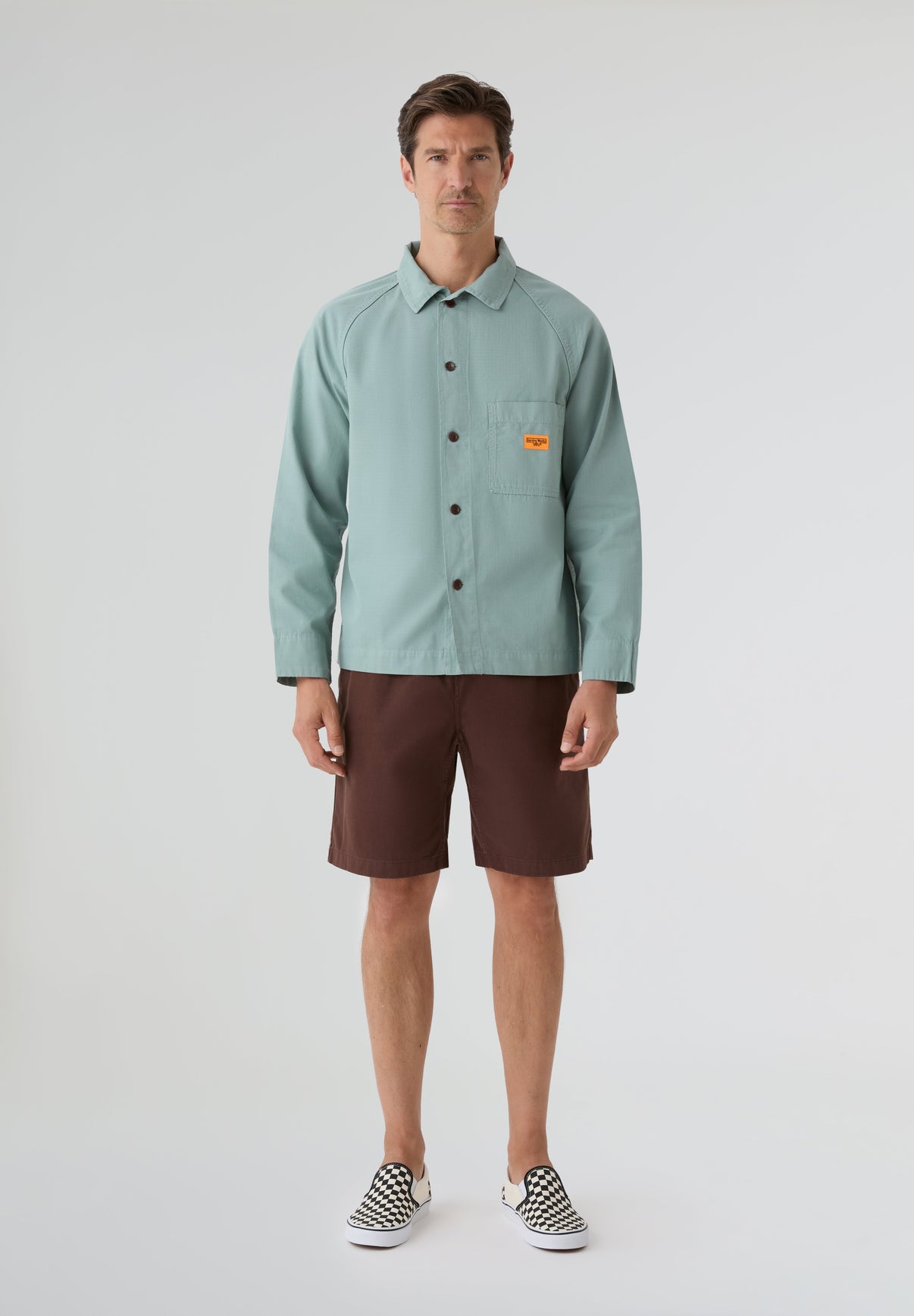 Sobrecamisa Service Work confeccionada en 100% algodón orgánico, con gran bolsillo en el pecho, cierre de cinco botones, cuello plano, mangas raglán y laterales abiertos. Detalle de etiqueta bordada en el bolsillo delantero.