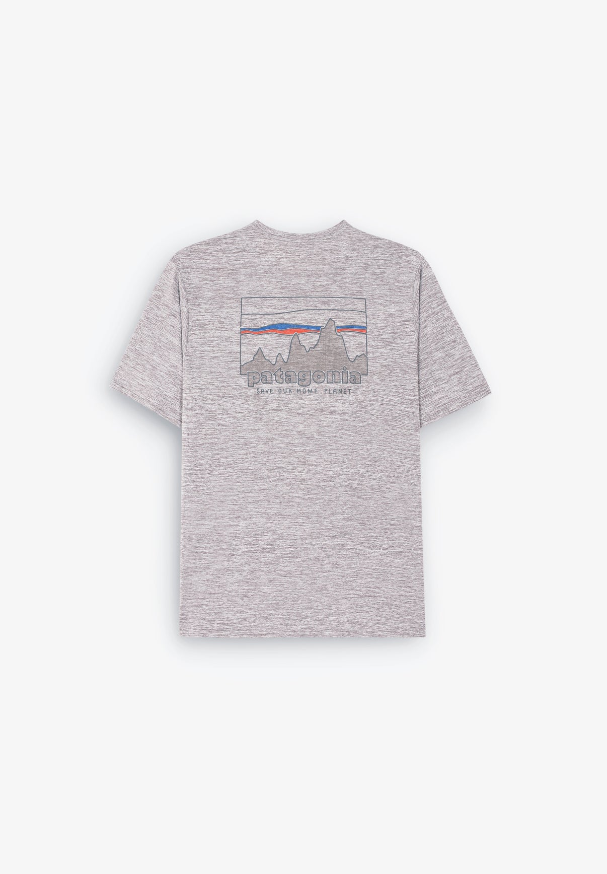 Camiseta Patagonia confeccionada en tejido 100% reciclado y corte regular. Presenta un cuello redondo clásico con ribetes, costuras selladas en los hombros y dobladillo recto en la parte inferior. Detalle de print delantero y trasero.