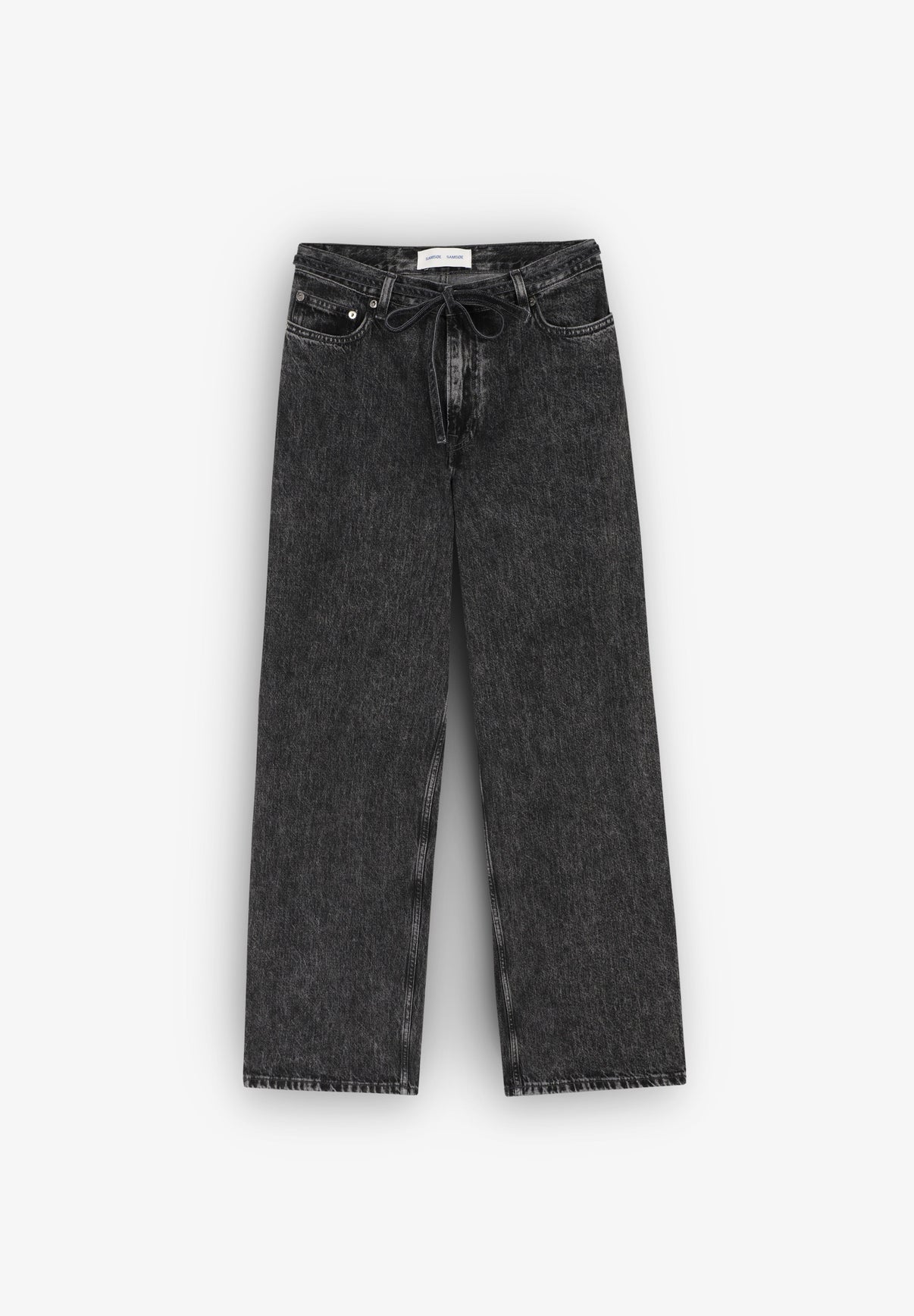 Pantalón vaquero Samsøe Samsøe confeccionado en 75% algodón orgánico y 25% algodón reciclado. Presentan un tiro medio, corte holgado y pernera curva. Cuentan con cierre frontal con botones y cremallera, trabillas y cinturón fino a juego.