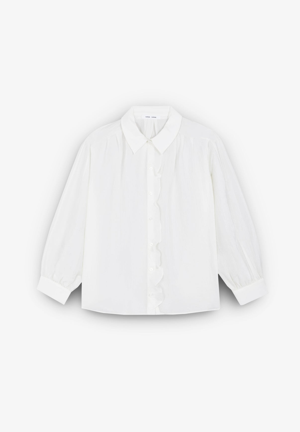 Camisa Samsøe Samsøe confeccionada en 82% TENCEL™ Lyocell y 18% poliamida. Presenta un corte holgado, cierre de botones en la parte delantera, mangas anchas y detalle de volante en la tapeta.